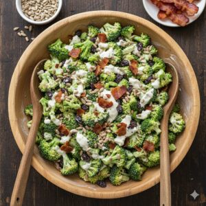 A simple, classic broccoli salad featuring a creamy, sweet, and tangy mayonnaise-based dressing and crunchy additions like bacon, sunflower seeds, and raisins.