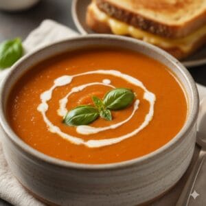 A comforting, classic tomato soup thickened with a roux and finished with warmed milk for a rich and creamy texture.